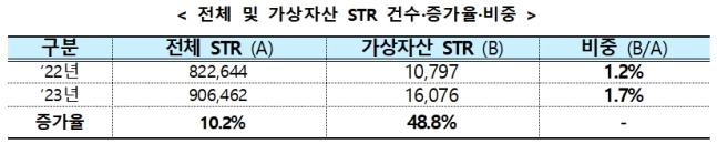 지난해 가상자산거래소 등 가상자산사업자의 의심거래보고(STR) 건수는 1만6076건으로, 전년 대비 약 49% 급증했다. 전체 STR에서 차지하는 비중도 1.2%에서 1.7%로 증가했다. 가상자산 관련 범죄 의심사례로 검찰, 경찰, 국세청 등 법집행기관에 통보한 건수 역시 지난해 대비 약 90% 증가했다.