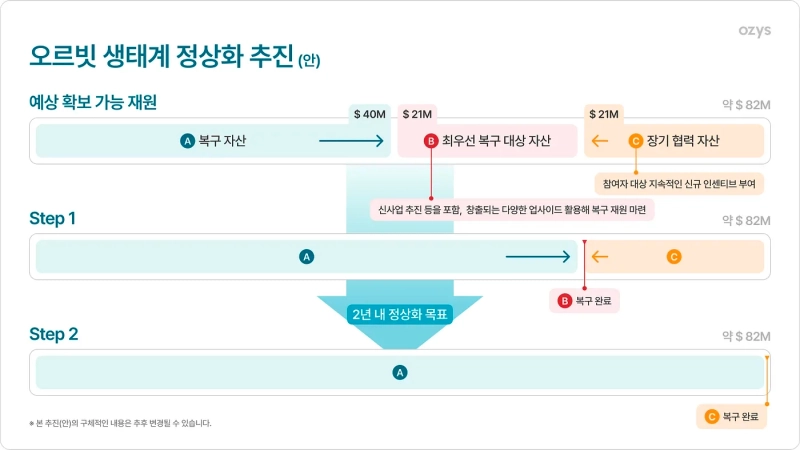 익스플로잇으로 1000억여원의 피해를 입은 오르빗 브릿지 개발사 '오지스'가 자산 복구 및 생태계 정상화 계획을 14일 발표했다.