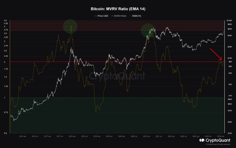 17일 가상자산(암호화폐) 분석 플랫폼 크립토퀀트(CryptoQuant)의 타렉온체인(Tarekonchain) 분석가는 퀵테이크 리포트를 통해 "현재 비트코인의 MVRV 지표는 2.06를 나타내고 있다"면서 "지표는 (상승세가 지속되기 위한) 임계값을 다소 상회했다. 강세장이 시작됐음을 암시하고 있다"라고 분석했다.