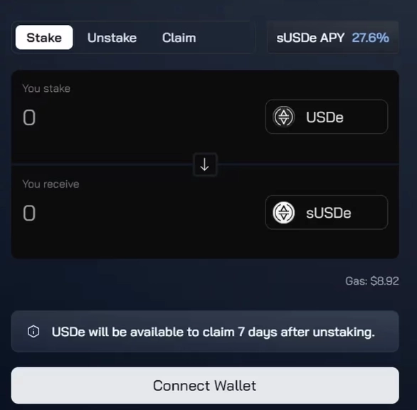 사용자들은 스테이블코인을 입금해 USDe를 발행할 수 있으며, 이를 스테이킹해 약 27%에 달하는 연 수익률을 제공한다. 수익은 이더리움 스테이킹과 선물 포지션 매도 컨트랙트를 통해 확보되며, 수익률은 각종 요인에 따라 매주 변경될 수 있다.