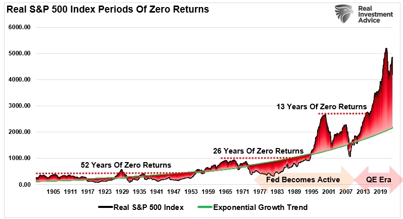무엇이 그런 반전의 원인이 될지는 알 수 없다. 그러나 현재 시장이 장기적인 기하급수적 성장 추세에서 벗어난 것을 고려할 때, 주식이 경제보다 더 빠른 성장을 지속하기는 더욱 어려워질 것이다. 특히 이러한 편차는 역사적으로 볼 때 오랜 기간 동안 매우 낮은 수익률\~제로 수익률로 이어졌다.