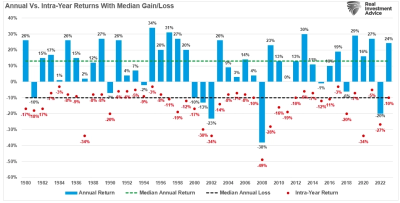 모멘텀과 심리에 의해 움직이는 상승장은 논리가 예측하는 것보다 더 오래 지속되고 더 멀리 갈 수 있다. 하지만 이러한 모멘텀에 의한 상승장에서도 5\~10%의 장중 조정이 발생하는 것이 일반적이다.