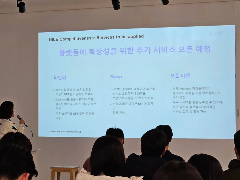 위메이드의 DAO·NFT(대체불가토큰) 플랫폼 '나일(NILE)'이 쟁글 블록체인 파운데이션 위크에서 판매 방식 다양화, 추가 서비스 오픈 계획 등을 밝혔다.