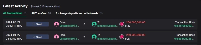 22일 블록체인 분석업체 스코프스캔(Scopescan)는 X(옛 트위터)를 통해 "DWF랩스는 이날 14시 43분경 바이낸스로 2억 FUN을 입금했다. 이는 약 112만달러(약 14억원) 규모"라고 전했다.