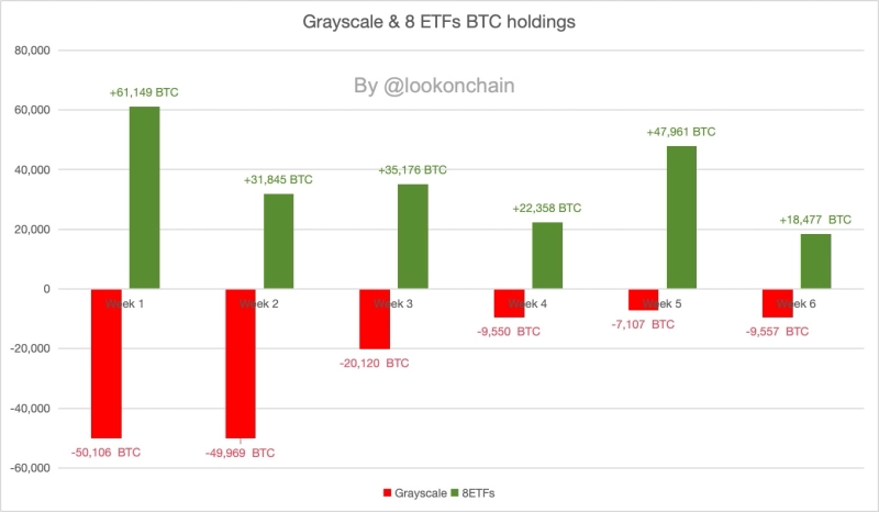 26일(현지시간) 룩온체인에 따르면 그레이스케일 외 8개 자산운용사의 비트코인 현물 ETF는 지난주 1만 8477 BTC를 유입시켰다. 이는 약 9억5100만달러 상당이며, 이전 주(2월 12일\~16일) 대비 감소한 수치이다.