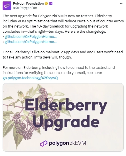 폴리곤 랩스가 26일(현지시간) 공식 X(구 트위터)를 통해 "폴리곤(MATIC) zkEVM 테스트넷에서 엘더베리(Elderberry) 업그레이드가 활성화 됐다"고 전했다.