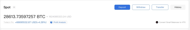 저스틴 선 HTX 계정의 잔액은 약 2만8000비트코인(BTC)으로, 현재 시세 기준 약 16억3000만달러 규모다.