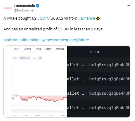 27일(현지시간) 룩온체인에 따르면 특정 월렛이 글로벌 가상자산(암호화폐) 거래소 바이낸스에서 1200비트코인(BTC)을 매입한 것으로 나타났다.
