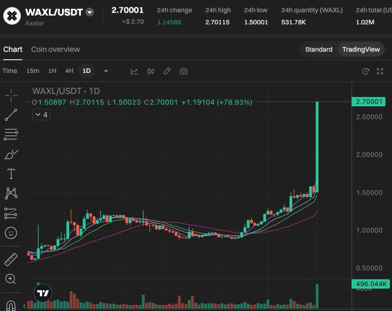 상장 소식 직후 비트겟에 상장된 엑셀라의 가격은 40% 가량 급등하며 2.7달러를 넘기며 사상 최고가를 재차 경신했다. 전일 대비로는 무려 70% 이상 폭등했다. 현재 엑셀라는 비트겟에서 2.7달러대에 거래되고 있다.
