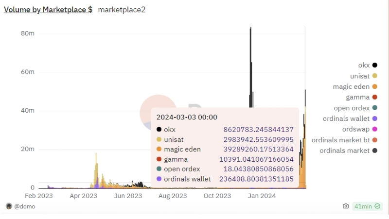 4일(현지시간) 우블록체인이 인용한 듄 애널리스틱스 데이터 따르면 오디널스 거래량은 지난 3일 5114만달러를 기록해 지난해 12월 18일 이후 사상 최고치를 기록했다.
