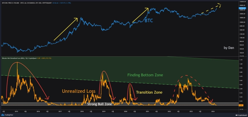 비트코인(BTC)이 극강세장(Strong Bull Zone, 손실중인 비트코인 비율이 매우 낮은 구간)에 진입했다는 의견이 나왔다.