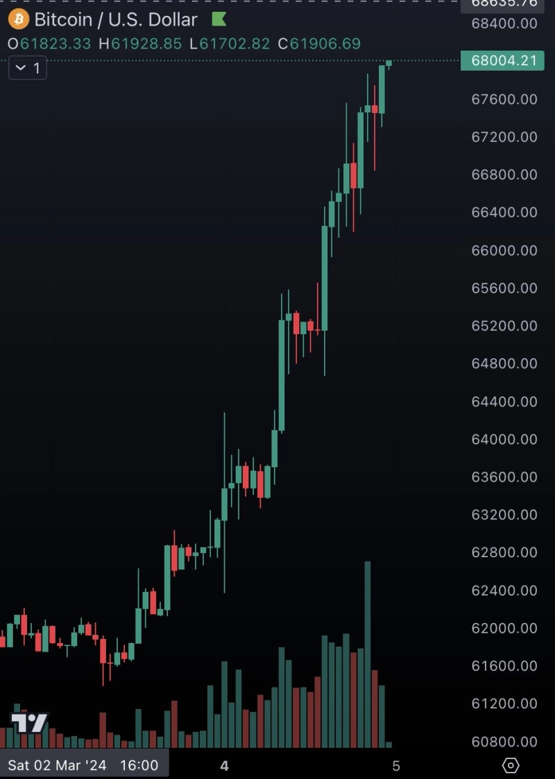 비트코인이 6만8000달러를 넘기며, 상승세를 이어가는 가운데 이더리움도 3700달러를 돌파했다.