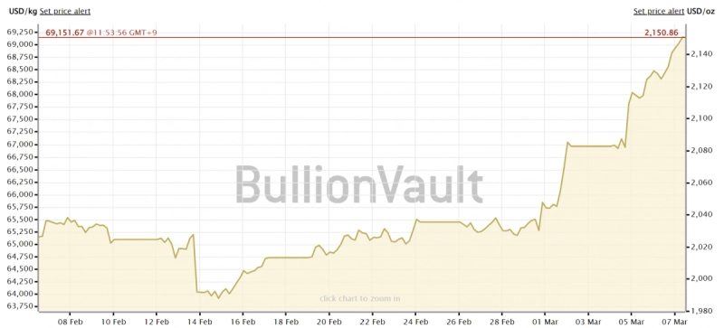 6일(현지시간) 미국 경제매체 CNBC에 따르면 금 현물은 이날 장 초반 온스당 2152.09달러까지 오르며 사상 최고가를 경신했다. 종가 역시 전일 대비 0.8% 상승한 2145.49달러에 마감했다. 4월물 금 선물은 0.8% 오른 2158.2달러를, 은은 1.9% 올라 24.15달러를 기록했다. 팔라듐은 10% 가까이 상승한 1035.83달러에 장을 마쳤다.