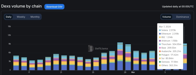 솔라나(SOL) 체인 기반 탈중앙화거래소(DEX) 거래량이 이더리움(ETH)을 넘어섰다.