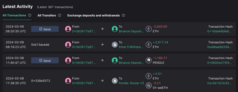 비수탁형 유동성 스테이킹 플랫폼 '이더파이(Ether.fi)에서 바이낸스로 대량의 이더리움(ETH) 이체가 발생했다.