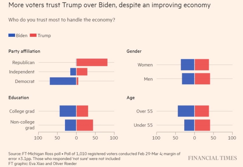 이와 대조적으로 바이든 대통령의 경제 정책을 긍정적으로 평가한 비율은 36% 수준에서 정체했다. 부정 여론은 4개월 새 59%에서 57%로 단 2%포인트 내리는 데 그쳤다. 경제 분야에서 바이든 대통령은 트럼프 전 대통령에 명확히 뒤처졌다. 트럼프 전 대통령의 경제 정책을 신뢰한다고 답한 비율은 40%로, 바이든 대통령(34%)보다 높았다. 양당 중 어느 한쪽도 지지하지 않는다고 밝힌 응답자 중에서도 29%가 바이든보다 트럼프를 신뢰했다. 트럼프보다 바이든을 믿는다고 답한 비율은 16%에 불과했다.