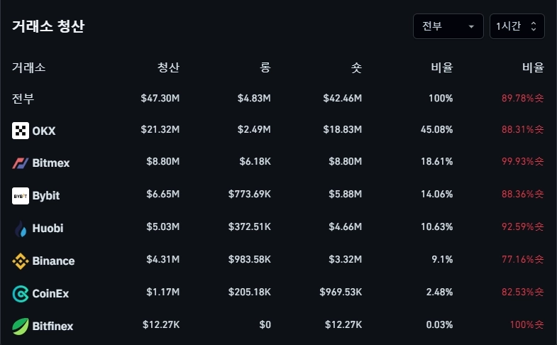 11일(현지시간) 가상자산 거래 데이터 플랫폼 코인글라스(Coinglass) 자료에 따르면 지난 1시간 동안 약 4730만달러의 선물 포지션이 청산됐다. 그 중 숏포지션의 비율은 89.78%에 육박한다.