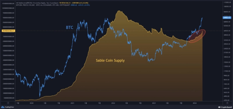 12일(현지시간) 크립토퀀트 저자 크립토 댄(Crypto Dan)은 "스테이블코인 공급은 최근 급격한 증가세를 보이고 있다. 이런 공급 증가는 비트코인뿐만 아니라 다른 코인에 대한 매수 수요를 나타낼 수 있다. 그만큼 시장 분위기는 긍정적"이라고 전했다.