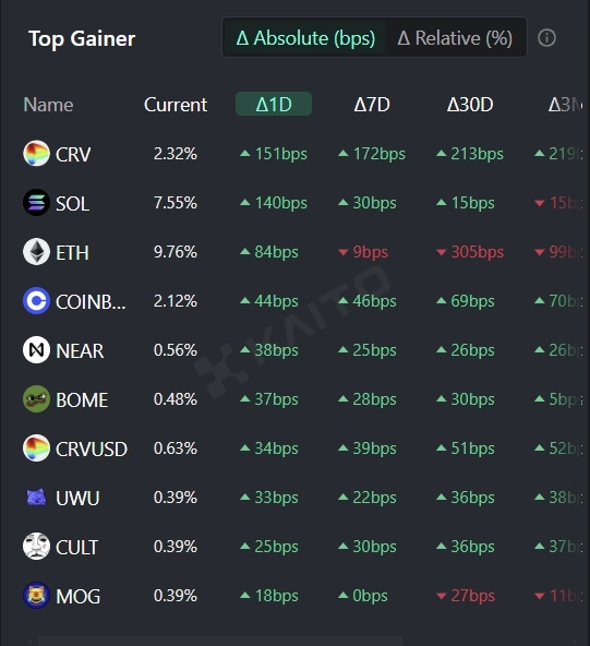인공지능(AI)기반 웹3 서치 플랫폼 카이토(Kaito)의 토큰 마인드셰어(Token Mindshare, 가상자산 시장 내 특정 토큰의 영향력을 정량화한 지표) 탑게이너에 따르면 14일 현재 사람들이 가장 많이 관심을 보이고 있는 가상자산 관련 키워드 상위 5개는 커브(CRV), 솔라나(SOL), 이더리움(ETH), 코인베이스(COINBASE), 니어프로토콜(NEAR) 등이다.