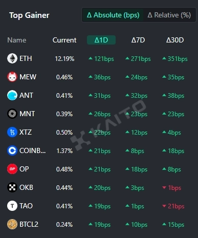 인공지능(AI)기반 웹3 서치 플랫폼 카이토(Kaito)의 토큰 마인드셰어(Token Mindshare, 가상자산 시장 내 특정 토큰의 영향력을 정량화한 지표) 탑게이너에 따르면 25일 현재 사람들이 가장 많이 관심을 보이고 있는 가상자산 관련 키워드 상위 5개는 이더리움(ETH), 캣인더독스월드(MEW), 아라곤(ANT), 맨틀(MNT), 테조스(XTZ) 등이다.
