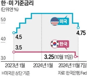 7일(현지시간) Fed가 연방공개시장위원회(FOMC) 정례회의에서 정책금리를 연 4.75~5.0%에서 연 4.50~4.75%로 0.25%포인트 인하하자 한국(연 3.25%)과의 금리 격차가 1.75%포인트에서 1.50%포인트로 좁혀졌다.