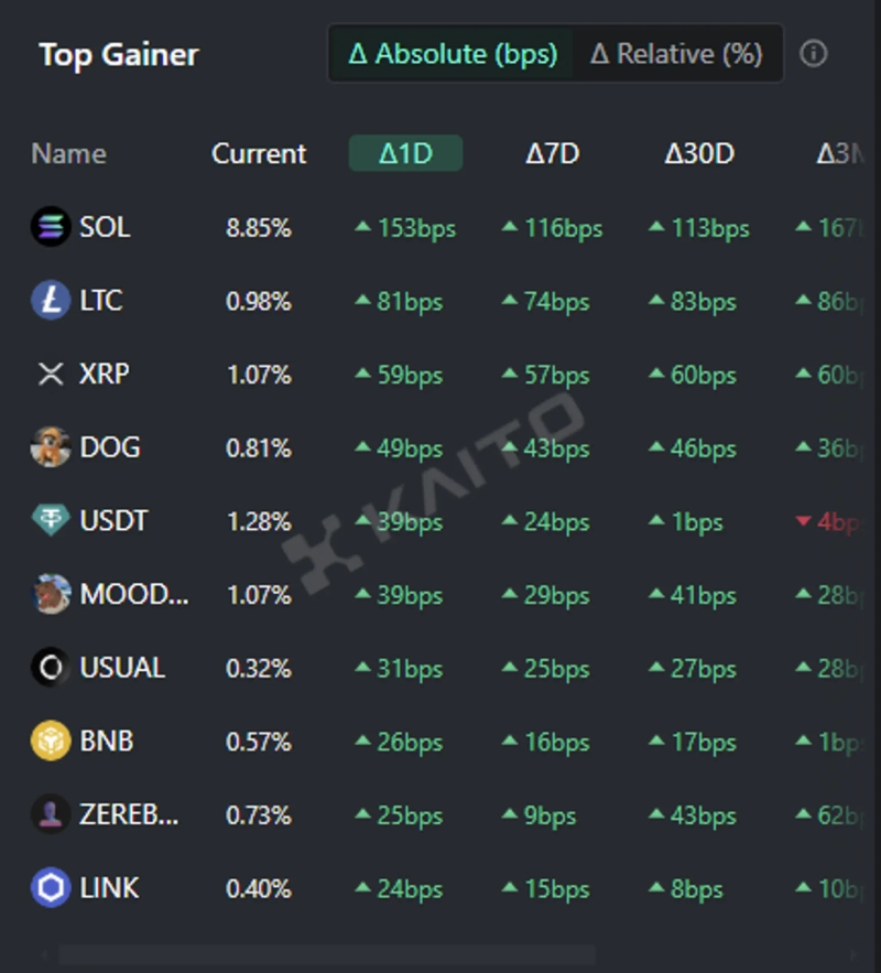인공지능(AI)기반 웹3 서치 플랫폼 카이토(Kaito)의 토큰 마인드셰어(Token Mindshare, 가상자산 시장 내 특정 토큰의 영향력을 정량화한 지표) 탑게이너에 따르면 15일 현재 사람들이 가장 많이 관심을 보이고 있는 가상자산(암호화폐) 상위 5개는 솔라나(SOL), 라이트코인(LTC), 리플(XRP), 도그(DOG), 테더(USDT) 등이다.