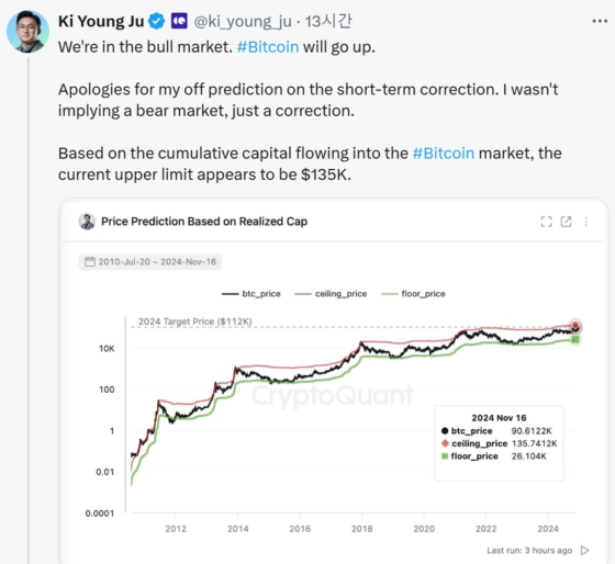 크립토퀀트(CryptoQuant) CEO 주기영이 2024년 비트코인의 가격 상단 목표가를 13만 5,000 달러로 조정했다. 그는 지난 2월 분석에서 2024년 비트코인 목표가 상단을 11만 2,000 달러로 제시했었다.