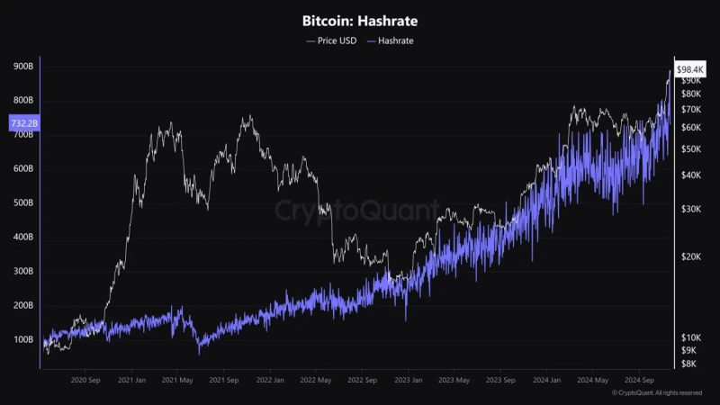 비트코인(BTC)의 가격 급등으로 채굴이 활발해지면서 해시레이트가 사상 최고치를 기록한 것으로 나타났다.