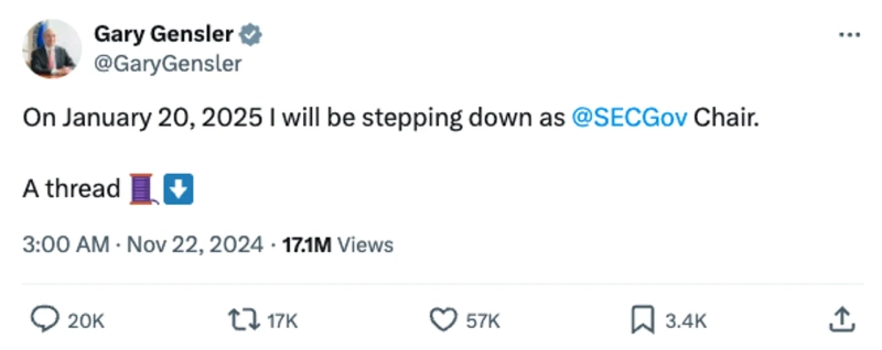 가상자산에 비우호적이었던 게리 겐슬러 SEC 위원장이 지난달 22일 내년 1월 사임하겠다고 밝힌 이후로 그간 증권성 논란에 휘말렸던 리플 등 알트코인 여럿은 최근 폭발적인 상승률을 기록했다. 겐슬러 위원장은 트럼프가 취임하는 날(내년 1월 20일) 사임할 예정이다. 해당 소식이 전해진 이후 리플은 이날까지 125% 급등했고 가상자산 시가총액 3위 올랐다. 같은 기간 스텔라(XLM)는 123%, 알고랜드(ALGO)는 172% 올랐다.