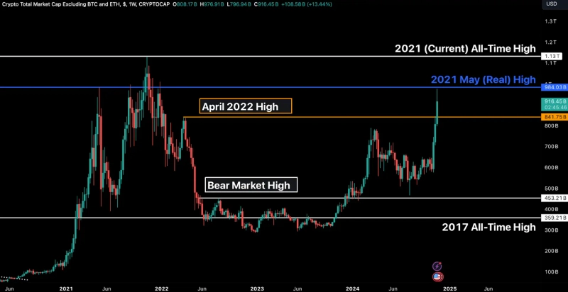 암호화폐 대장주 비트코인(BTC)이 10만달러를 앞두고 숨을 고르고 있는 가운데 알트코인(비트코인 외 암호화폐)의 거래량과 시가총액은 큰 폭으로 증가하고 있다. 알트코인의 반등 기대감이 한층 높아지면서 알트코인 순환장이 임박했다는 전망이 제기된다.