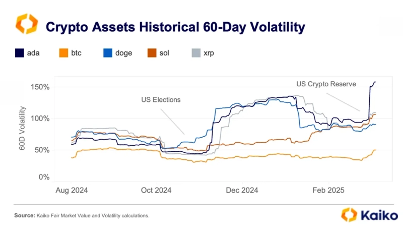 트럼프 행정부의 암호화폐 전략비축 계획이 기대에 미치지 못하면서 단기 투자심리가 위축됐다는 분석도 나온다. 암호화폐 데이터 분석 기업 카이코는 최근 연구 보고서에서 "트럼프 행정부의 암호화폐 전략비축 계획이 예상보다 미흡하자 시장에선 급격한 변동성이 촉발됐다"라고 진단했다. 카이코에 따르면 이달 들어 알트코인 시장의 변동성은 급증했다. 카르다노는 변동성이 150%에 도달하며 역대 최고치를 경신했고, 솔라나와 엑스알피도 100%가 넘는 높은 변동성을 보였다.