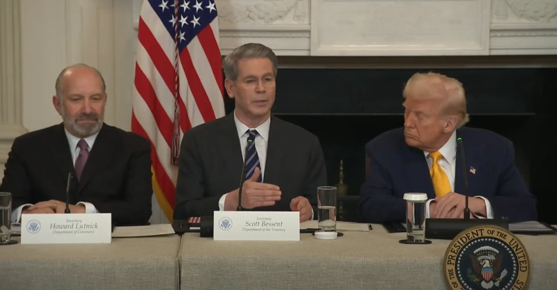 하워드 러트닉 미국 상무부 장관, 스콧 베센트 미국 재무부 장관, 도널드 트럼프 미국 대통령이 암호화폐 정상회담에서 발언하고 있다. / 사진 = 백악관 유튜브 캡쳐