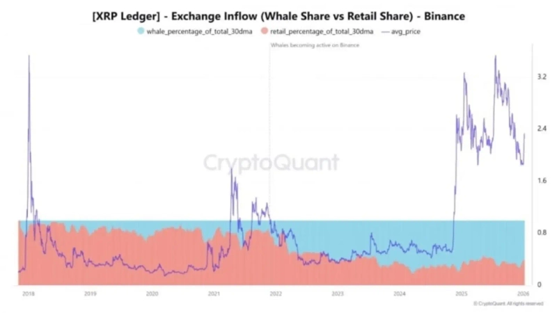 바이낸스로 유입되는 물량도 감소하고 있는데요. 크립토퀀트에 따르면 고래가 차지하는 거래소 유입 비중이 지난해 말 70%를 넘겼다가 지난 8일 기준 60% 초반대로 내려왔습니다. 이는 직접적인 매도 압력이 완화되는 신호로 해석됩니다.