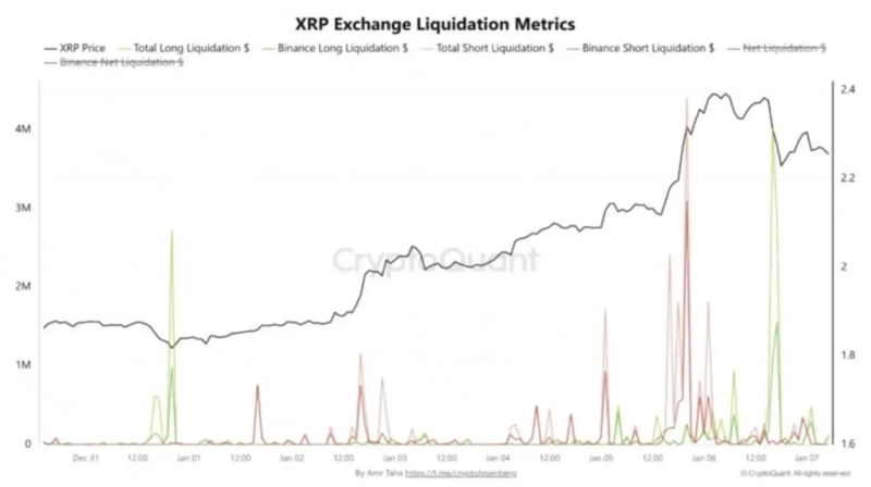 이번 움직임에는 현물보다 파생시장의 영향이 더 컸다는 분석이 우세했습니다. 초반 급등은 숏 포지션 청산이 크게 작용했는데요. 크립토퀀트 데이터에 따르면 1월 5일 약 440만달러 규모의 숏 청산이 발생하면서 가격이 2.4달러 근처까지 치솟았는데, 강한 현물 매수라기보다는 숏 커버링 성격이 강한 반등이었다는 분석입니다. 다음 날 가격이 되돌림 구간에 들어서자 이번에는 약 400만달러 규모의 롱 청산이 발생했는데요.
