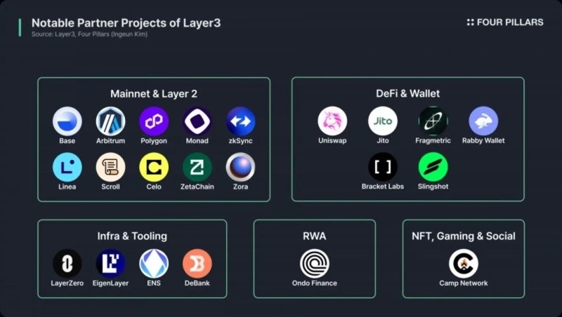 이 외에도 유니스왑(Uniswap), 베이스(Base), 아비트럼(Arbitrum), 옵티미즘(Optimism) 등 50개가 넘는 웹3 생태계의 주요 프로젝트들이 레이어3를 통해 사용자를 확보하고 있다. 레이어3 사용자들이 아비트럼 전체 에어드랍의 20.4%, zkSync 에어드랍의 29.7%를 수령했다는 사실은 레이어3 커뮤니티가 웹3에서 가장 활발하고 영향력 있는 사용자 집단 중 하나임을 명백히 보여준다.
