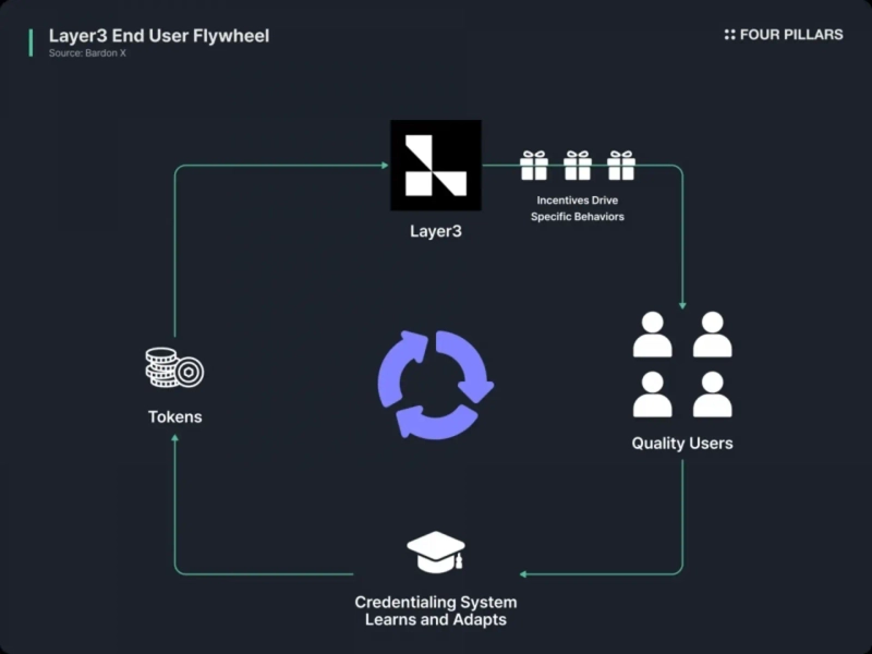 이러한 성장은 아마존이나 쇼피파이와 유사한 전형적인 양면 시장(two-sided marketplace) 플라이휠 효과에 의해 구동된다. 더 많은 사용자가 모이면 더 많은 프로젝트가 유입되고, 더 많은 프로젝트가 다양한 퀘스트와 보상을 제공하면 다시 더 많은 사용자를 끌어들이는 선순환 구조다. 레이어3는 여기에 L3 토큰의 매수/소각 메커니즘을 결합하여, 플랫폼의 성장이 직접적으로 토큰 가치 상승으로 이어지게 함으로써 이 플라이휠에 훈풍을 불어다주고 있다.