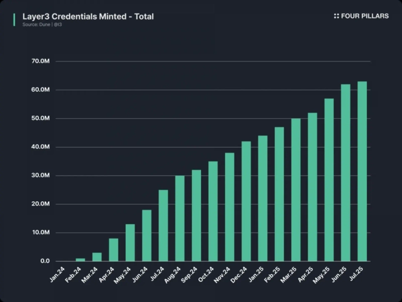레이어3의 성장은 구체적인 지표로 확인된다. 2025년 7월 기준, 누적 사용자는 320만 명을 넘어섰으며(고유 지갑 기준 약 820만 개), 플랫폼에서 완료된 퀘스트 및 트랜잭션 수는 1억 6천 7백만 건을 돌파했다. 월간 웹사이트 방문자 수는 190만 명에 달하며 평균 세션 시간은 15분을 상회하는 등 높은 사용자 몰입도를 보이고 있다.