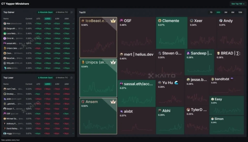 이러한 정보 탐색의 어려움을 해결하고자, 카이토(Kaito)와 같이 AI를 활용해 크립토 트위터(Crypto Twitter) 환경 속에서 프로젝트의 인지도(Mindshare)를 분석하고 순위화하는 플랫폼이 주목받았다. 카이토는 사용자 참여를 유도하기 위해 콘텐츠를 생성하거나 공유하는 활동에 포인트를 부여하는 보상 시스템을 도입했다.