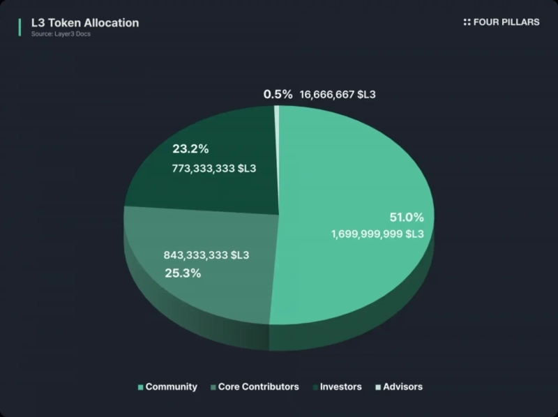 레이어3 생태계의 중심에는 네이티브 토큰인 $L3가 있다. 총 33억 3천만 개가 발행된 $L3 토큰은 단순한 보상 수단을 넘어, 플랫폼의 성장을 가속화하고 모든 참여자의 이해관계를 일치시키는 경제적 엔진 역할을 하도록 설계되었다.