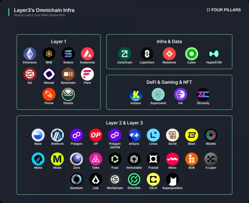레이어3의 또 다른 특징은 특정 생태계에 얽매이지 않는 "옴니체인(omnichain)" 접근 방식이다. 이 플랫폼은 이더리움, 솔라나(Solana) 같은 주요 레이어1 체인은 물론, 베이스(Base), 아비트럼(Arbitrum), 폴리곤(Polygon) 등 45개가 넘는 다양한 블록체인을 지원한다. 이를 통해 레이어3는 파편화된 웹3 환경에서 진정한 의미의 애그리게이터(aggregator)로 기능할 수 있는 기반을 마련했다.