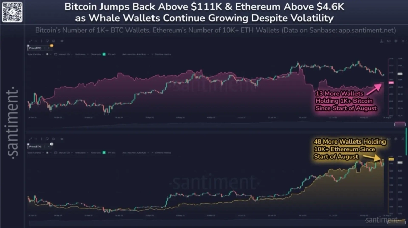 고래들은 이더리움 매입을 지속하고 있다. 지난 25일 온체인 분석업체 산티멘트는 "8월 이더리움의 고래(대형 보유자) 지갑 수는 꾸준히 늘어나며 시장 (추가) 반등의 기반을 마련하고 있다"고 분석했다. 이달 들어 이더리움 1만 ETH 이상 보유 지갑은 48개 늘어난 1275개를 기록했다.