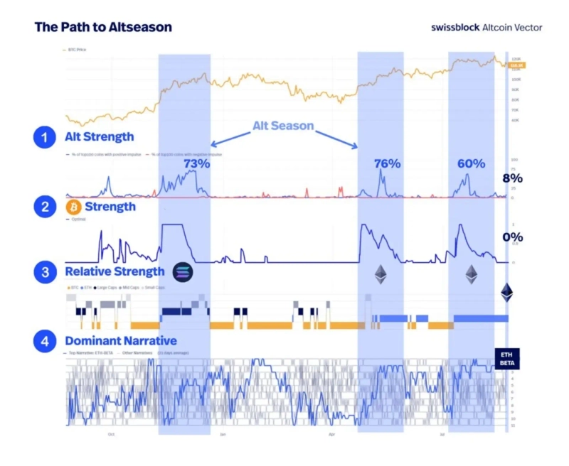 한동안 이더리움 중심으로 시장이 흘러갈 것이란 분석도 나온다. 암호화폐 리서치 업체 스위스블록은 팟캐스트를 통해 "이더리움이 2021년 이후 처음으로 시장의 주도권을 되찾고 있다. 시장의 무게 중심이 이더리움으로 옮겨가고 있다"고 진단했다. 또 "그동안 '비트코인 → 알트코인 → 스테이블코인'으로 이어지던 흐름이 이제는 이더리움으로 집중되고 있다"고 덧붙였다. 앞서 코웬 분석가는 "지금은 알트코인 시즌이 아니라 이더리움 시즌"이라고 강조한 바 있다.