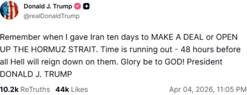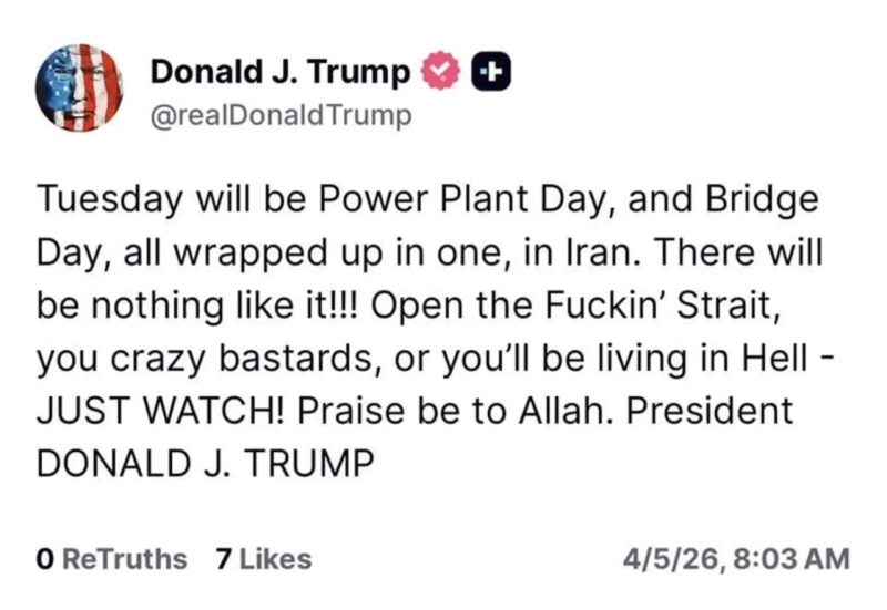 트럼프 대통령은 이날 오전 소셜미디어 트루스소셜에 7일 이란 발전소와 교량 등 핵심 인프라에 대한 대대적 공격을 퍼붓겠다고 예고하면서 호르무즈 해협 개방과 합의 타결을 종용했다. 그는 "빌어먹을 해협을 당장 열어라, 이 미친 놈들아. 그렇지 않으면 지옥에서 살게 될 것이다. 알라에게 찬양을" 등 비속어를 써 가면서 폭언을 퍼부었다.