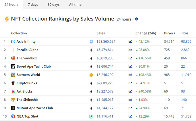 더 샌드박스(SAND)의 NFT 판매액이 BAYC를 제치고 3위에 올랐다.