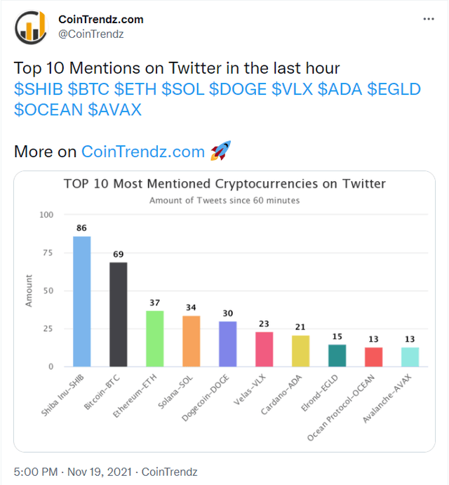 가상자산(암호화폐) 마켓 데이터 플랫폼 코인트렌즈닷컴에 따르면 20일 오전 2시 기준 1시간 동안 트위터에서 가장 많이 언급된 가상자산은 시바이누(SHIB, 86회)이다.
