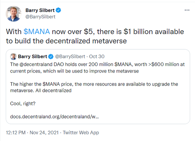 24일 배리 실버트(Barry Silbert) 디지털 커런시 그룹(DCG) 창업자가 자신의 공식 트위터에서 디센트럴랜드(MANA)를 언급했다.