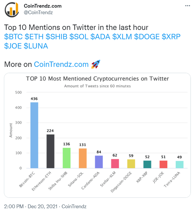 4위~10위에는 솔라나(SOL, 131회), 카르다노(ADA, 84회), 스텔라루멘(XLM, 62회), 도지코인(DOGE, 59회), 리플(XRP, 52회), 조(JOE, 51회), 테라(LUNA, 49회) 등이 이름을 올렸다.