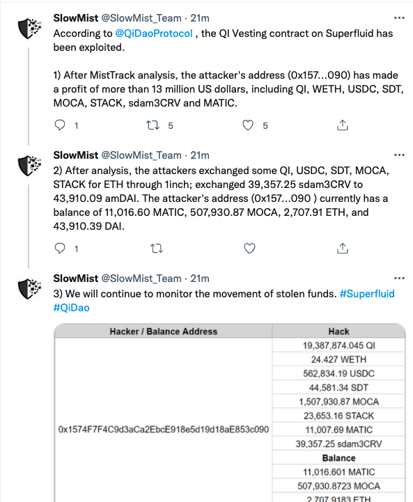 슬로우미스트는 "슈퍼플루이드의 치(QI) 베스팅 컨트랙트가 공격당한 것으로 보인다"면서 "공격자는 QI, 랩이더(WETH), 유에스디코인(USDC), 폴리곤(MATIC) 등 여러 토큰을 1300만달러치 갈취했으며 일부를 원인치(1INCH) 거래소로 옮겼다. 우리는 이들을 계속 모니터링할 것"이라고 밝혔다.