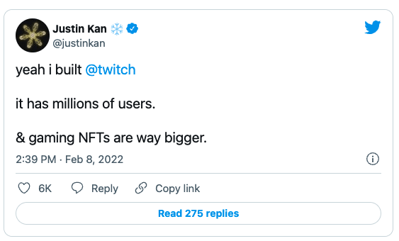 칸은 이날 자신의 트위터를 통해 "나는 트위치를 만들었고 트위치에는 수백만명의 사용자가 있다. 그리고 NFT 게임은 트위치보다 훨씬 규모가 크다"고 말했다.