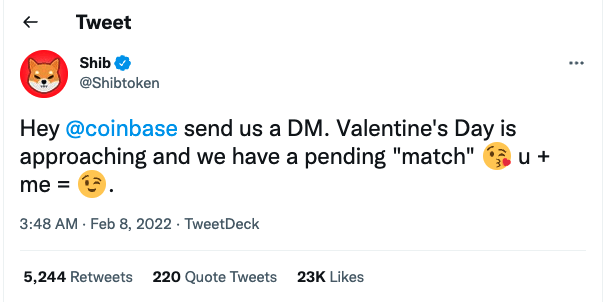 앞서 이날 시바이누(SHIB) 공식 트위터 계정은 "발렌타인 데이가 다가오고 있다"면서 "코인베이스는 우리에게 DM(다이렉트 메시지)를 보내달라. 우리는 매칭될 수 있다"는 게시글을 남긴 바 있다.